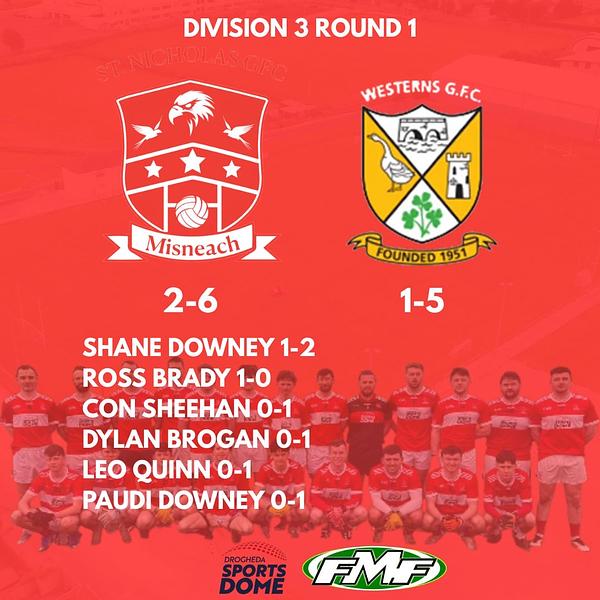 Playing against the elements in the second half, the Drogheda men had to keep the ball in hand as kick passing was almost impossible. Good work from Caebhan Housidari and Hayden Quinn found Shane Downey at the edge of the square who doubled his tally for the day and ectended the lead. A fine two point free kept the Westerns in touch, but it was Downey again to extend the Nicks lead as he found the top corner of the Westerns net. The concession of the goal done nothing to dishearten the home side, who found the net themselves following a scramble in the Nicks box. The scoreline was tight for the remainder of the half until a Con Sheehan point and Ross Brady goal done enough for St. Nicholas to take the two points.