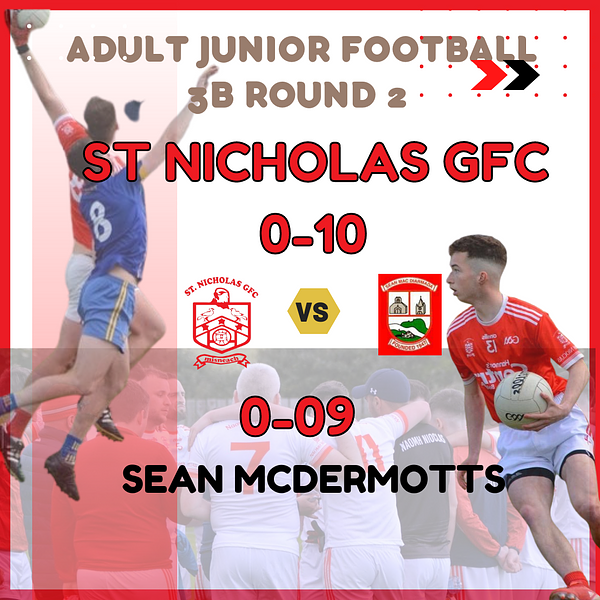 Following a disappointing result on day one of division 3B, St.Nicholas registered their first win after a hard fought encounter in Pรกirc Mac Diarmada. Both teams defences were on top early but it was the home team who opened the scoring with two back to back frees. A Philip Kirwan free took the nicks to one behind midway through the half. The Sean's added another two from play. The visitors forward line were getting a bit more joy late in the half with Lee Kavanagh and another Kirwan point keeping them within one. Both teams exchanged scores at the end of the half with Aaron Flanagan's score leaving the Nicks behind by the minimum at the break.